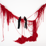 As a neurodivergent woman with ADHD and Autism, she works with soft wool, which she finds immensely comforting. This, alongside the pliability of the figures, transforms the process of creation into a form of sensory play, as she works intuitively to create each new Llinynnau’r Galo / Heartstrings composition according to her thoughts and feelings at the time. While she can control the positioning of the crocheted figures, the shaping of the heartstrings themselves is often unpredictable, forming a parallel with the sometimes erratic nature of the thoughts and feelings that accompany being human.