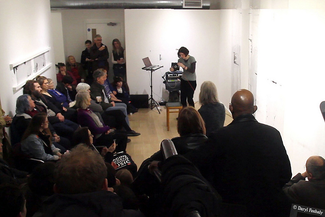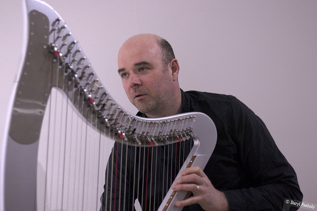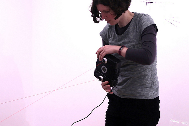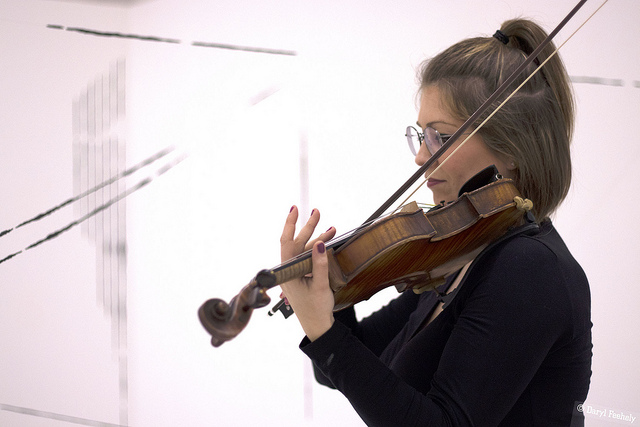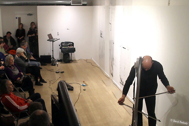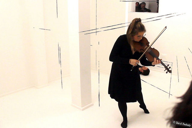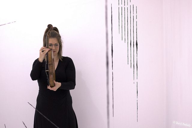 Musicians Rhodri Davies (Harpist), Angharad Jenkins (Violinist) and Jenn Kirby (Composer & electronics) each respond to Hazel Cardew’s exhibition ‘Of Line and Structure’ by treating Cardew’s drawing installation as graphic scores to compose live music from.