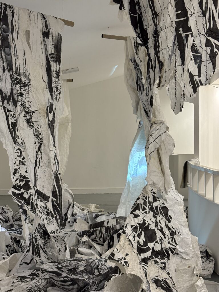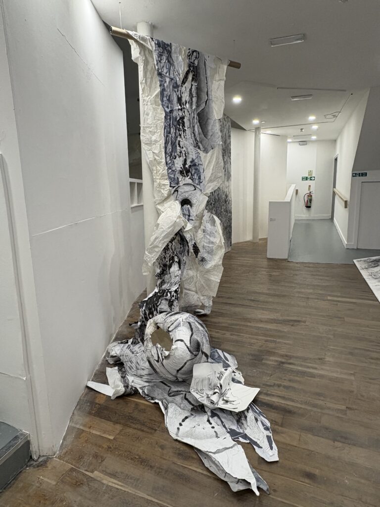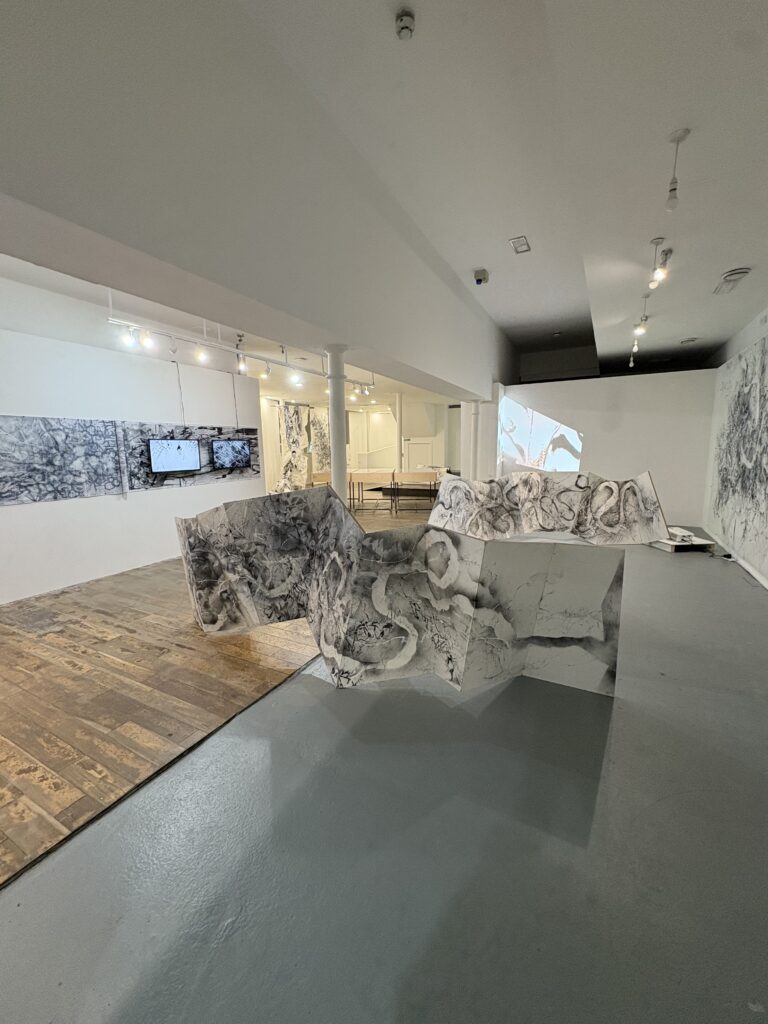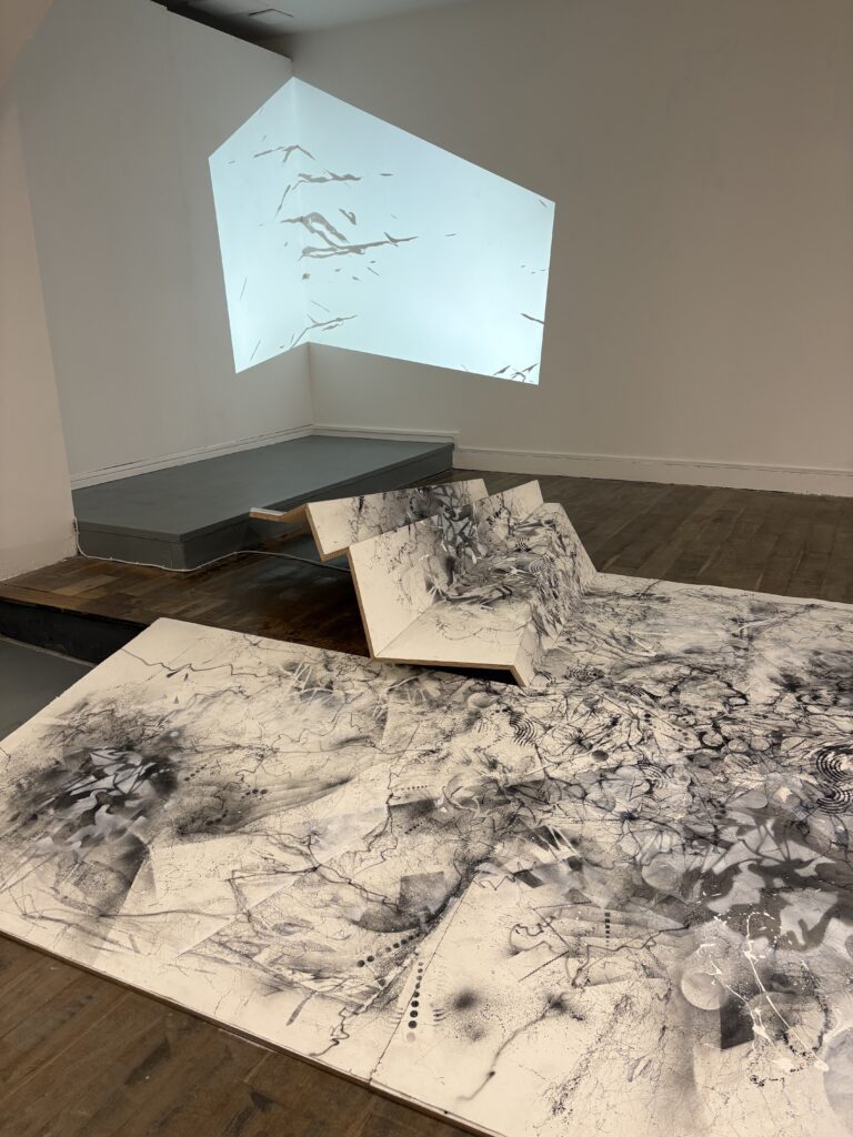 Exploring this rhythmical pattern, I reach out via engagement workshops to investigate if this rhythm can benefit participants within the context of practical mark-making workshops. I combine their responses with my own work and animate the drawings through moving image pieces integrated with drawings on sculptural forms that must be negotiated, embedding movement, collaboration and participation in response to this “universal rhythmical unit”